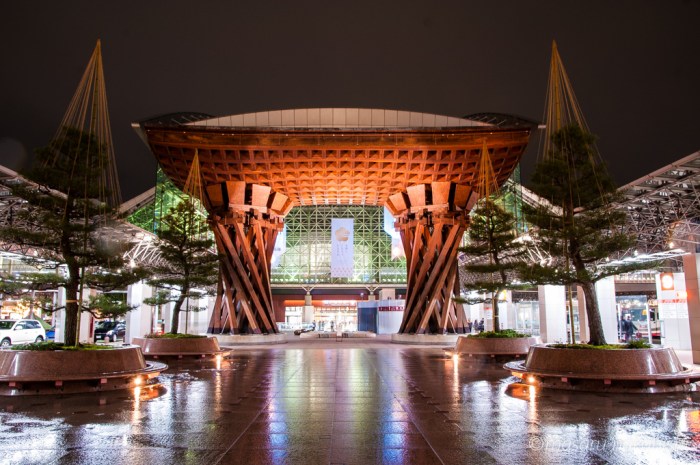 金沢の玄関口として、特徴的な造りになっている駅です。兼六園口の方には鼓門(つづみもん)という名の立派な門があり、その地下は「もてなしドーム」というイベントスペースになっています。